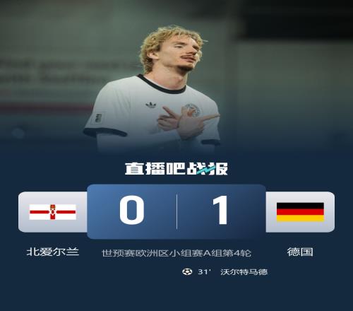 世預(yù)賽德國(guó)挑戰(zhàn)北愛爾蘭,沃爾特馬德頭球破門,下半場(chǎng)阿德耶米失單刀,德國(guó)1-0北愛爾蘭取得三連勝。